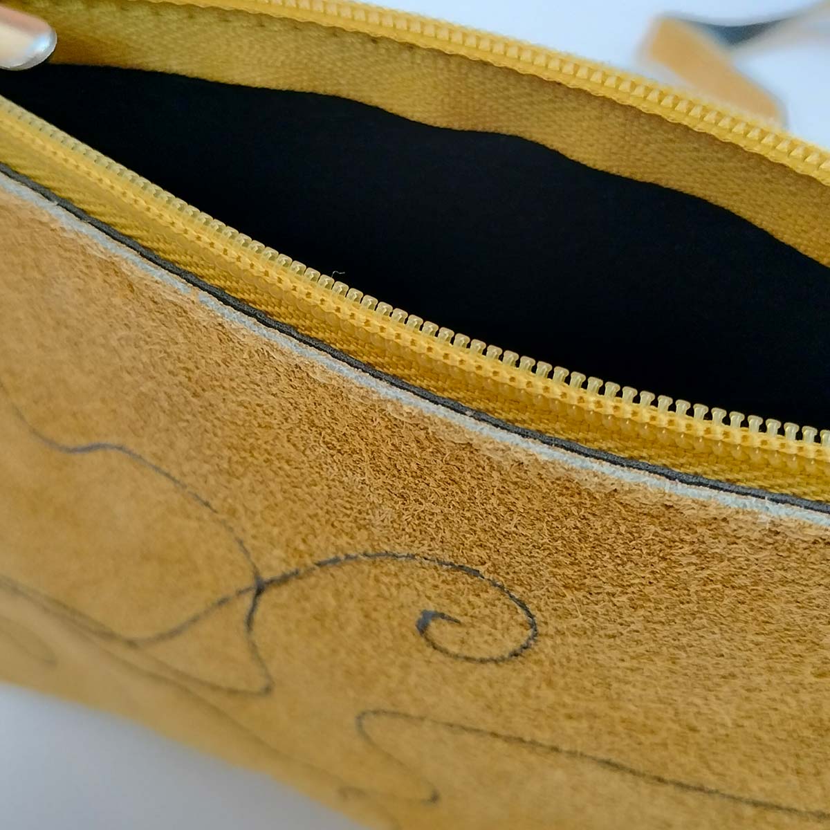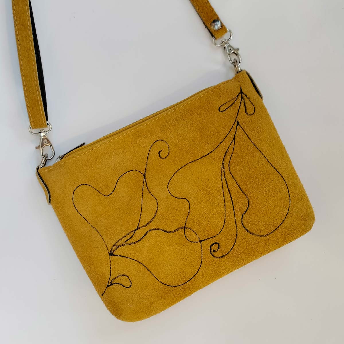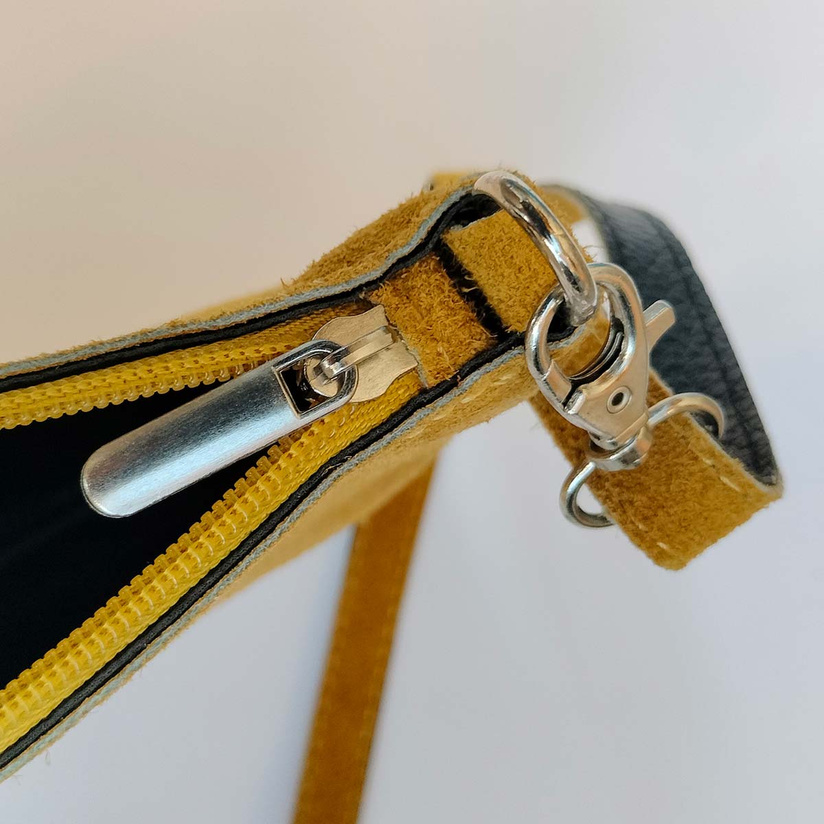 Confeccionada en pell girada gruixuda i resistent, manté una estructura sòlida amb un tacte càlid i natural. La cinta regulable permet portar-la creuada o a l’espatlla, adaptant-se a cada moment amb elegància i comoditat.