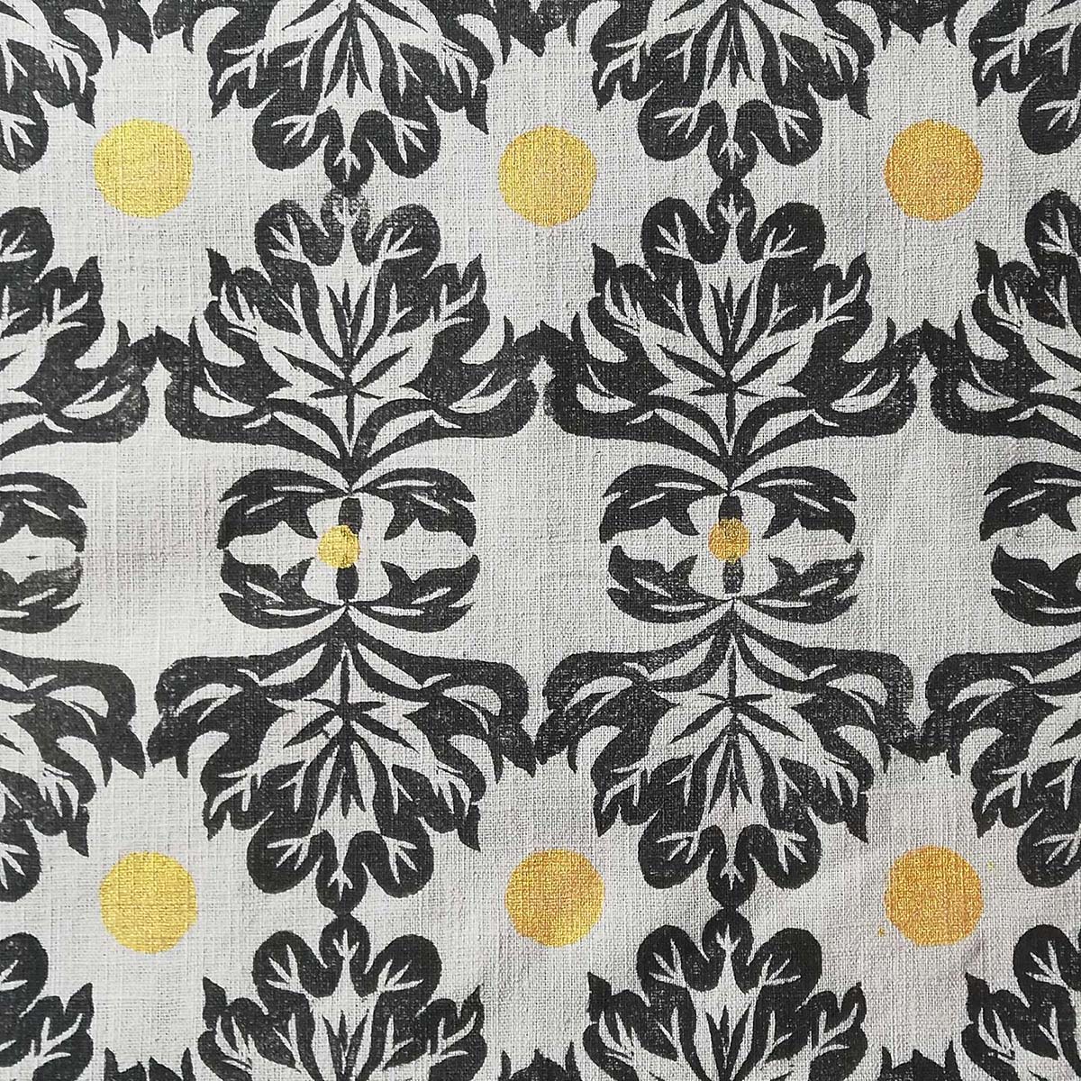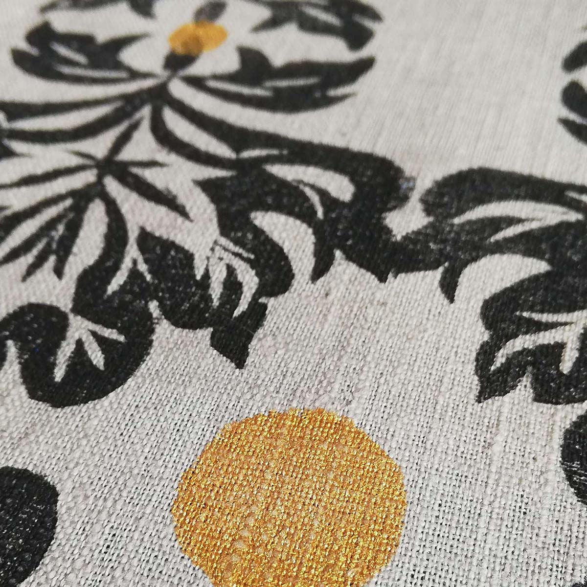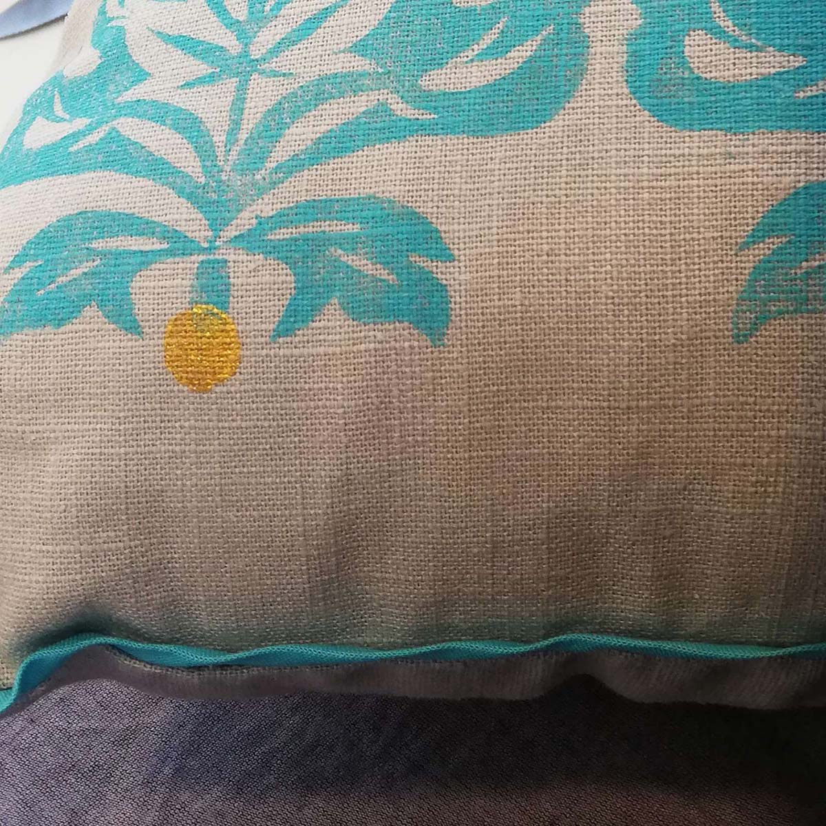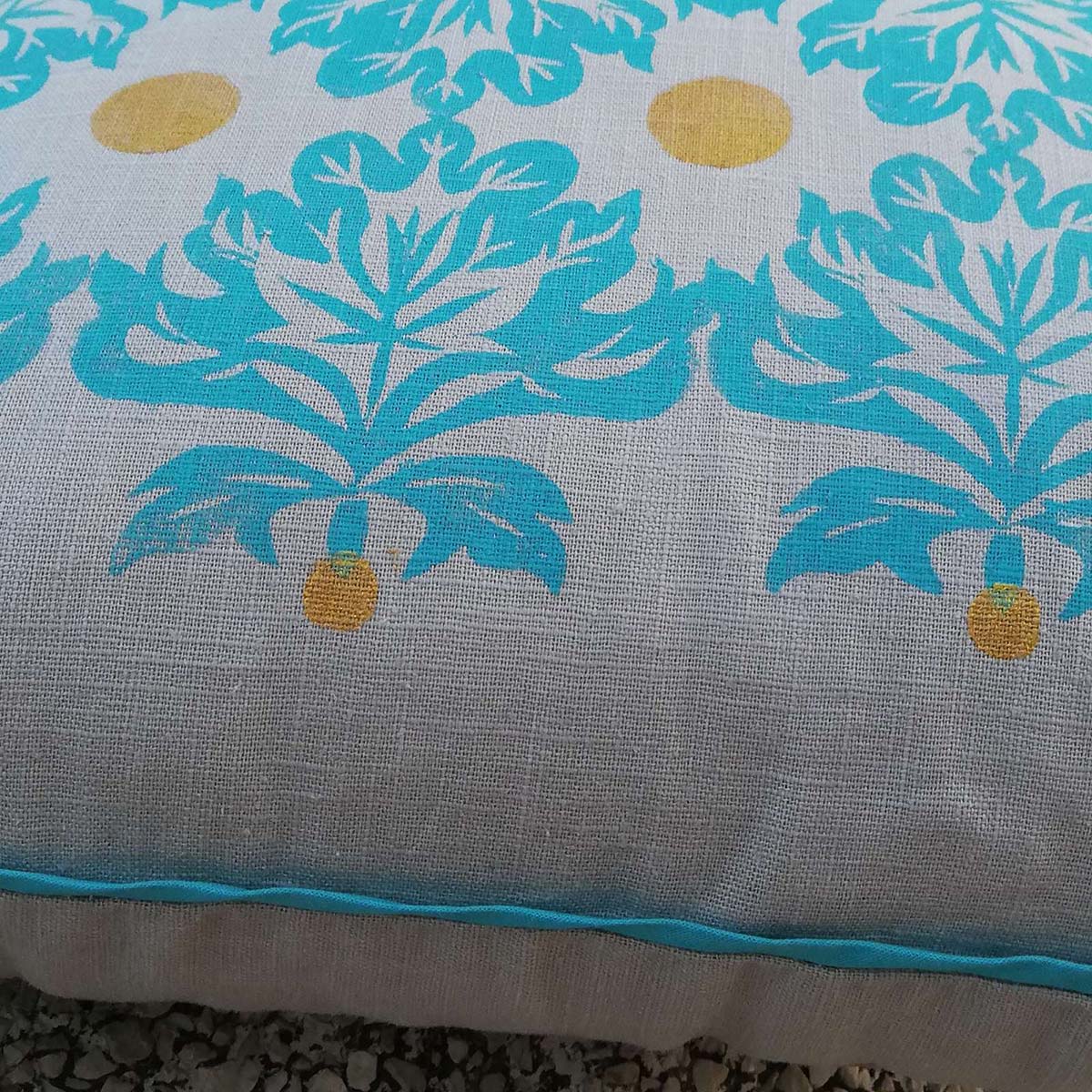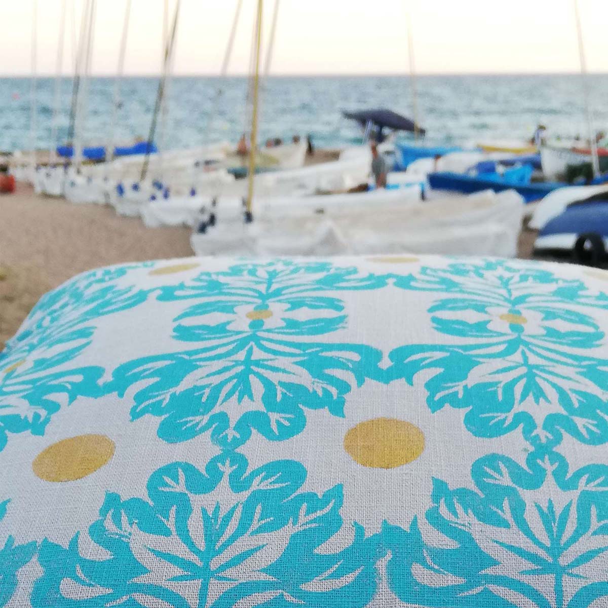 Coixí artesanal estampat a mà a dos colors —un d’ells or— a triar si es vol com a segon color el turquesa o negre, creant un contrast sofisticat que aporta personalitat i calidesa a qualsevol espai. Una peça amb caràcter propi, feta per donar vida a la teva llar.
