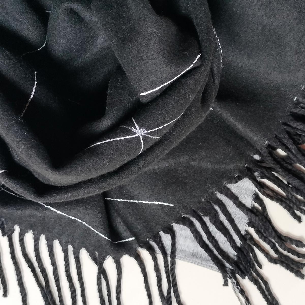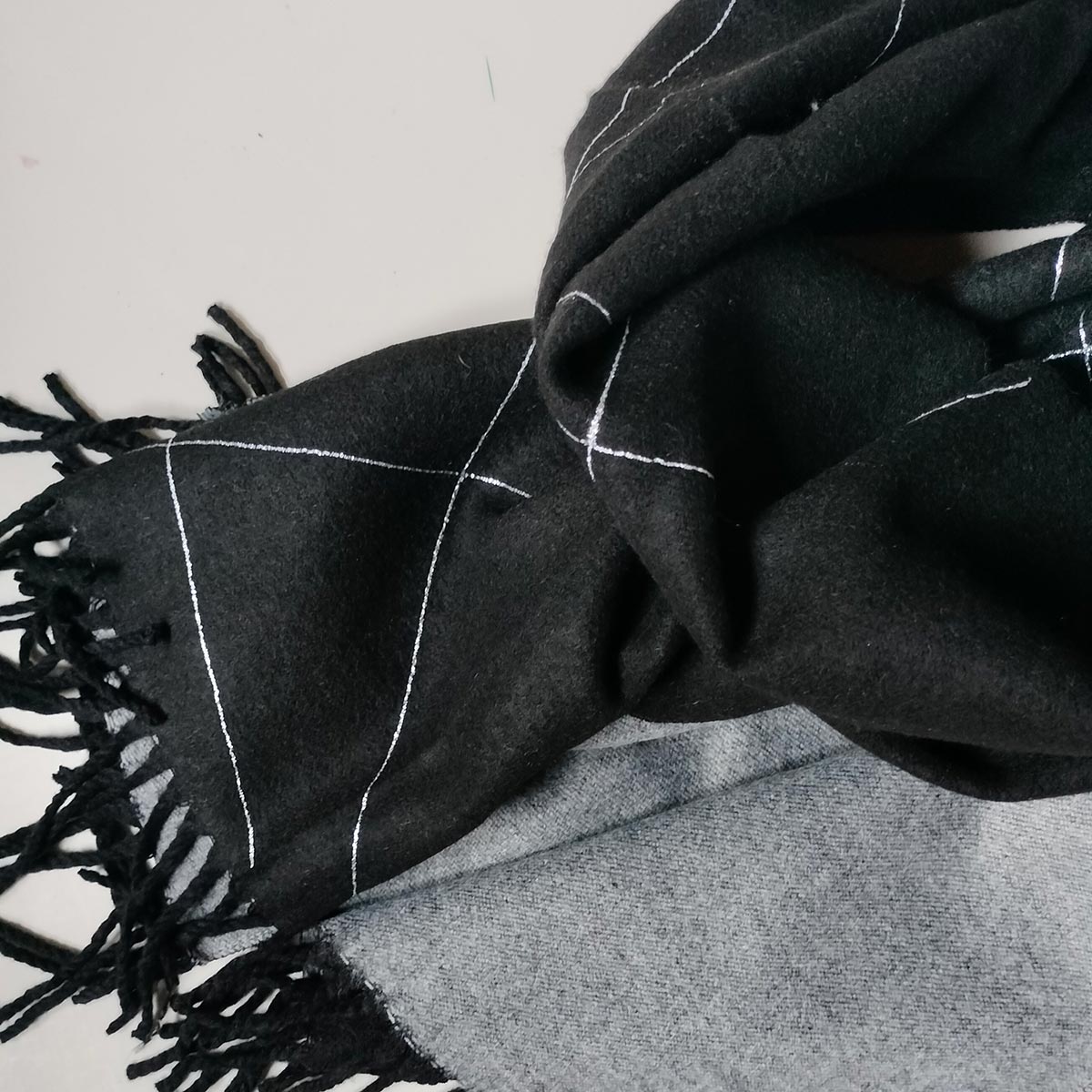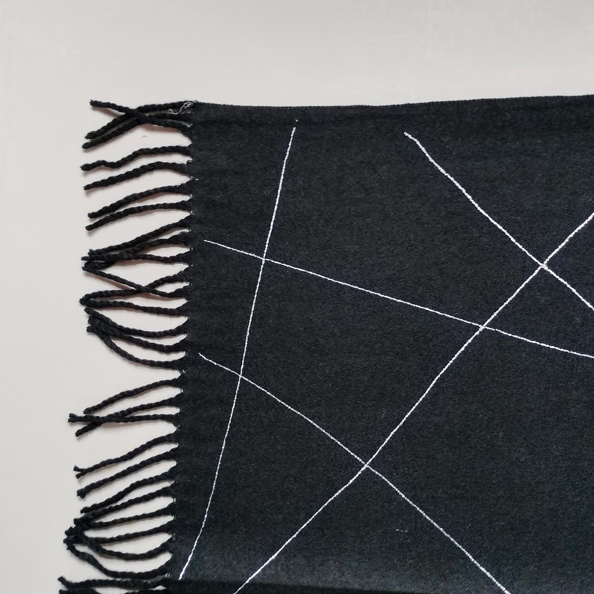 El foulard LÍNIES és una peça de llana amb acabat imitació de caixmir, coneguda pel seu tacte suau i càlid que convida a refugiar-s’hi. De doble cara, juga amb dos tons principals —negre i gris—, creant un equilibri entre contrast i harmonia.