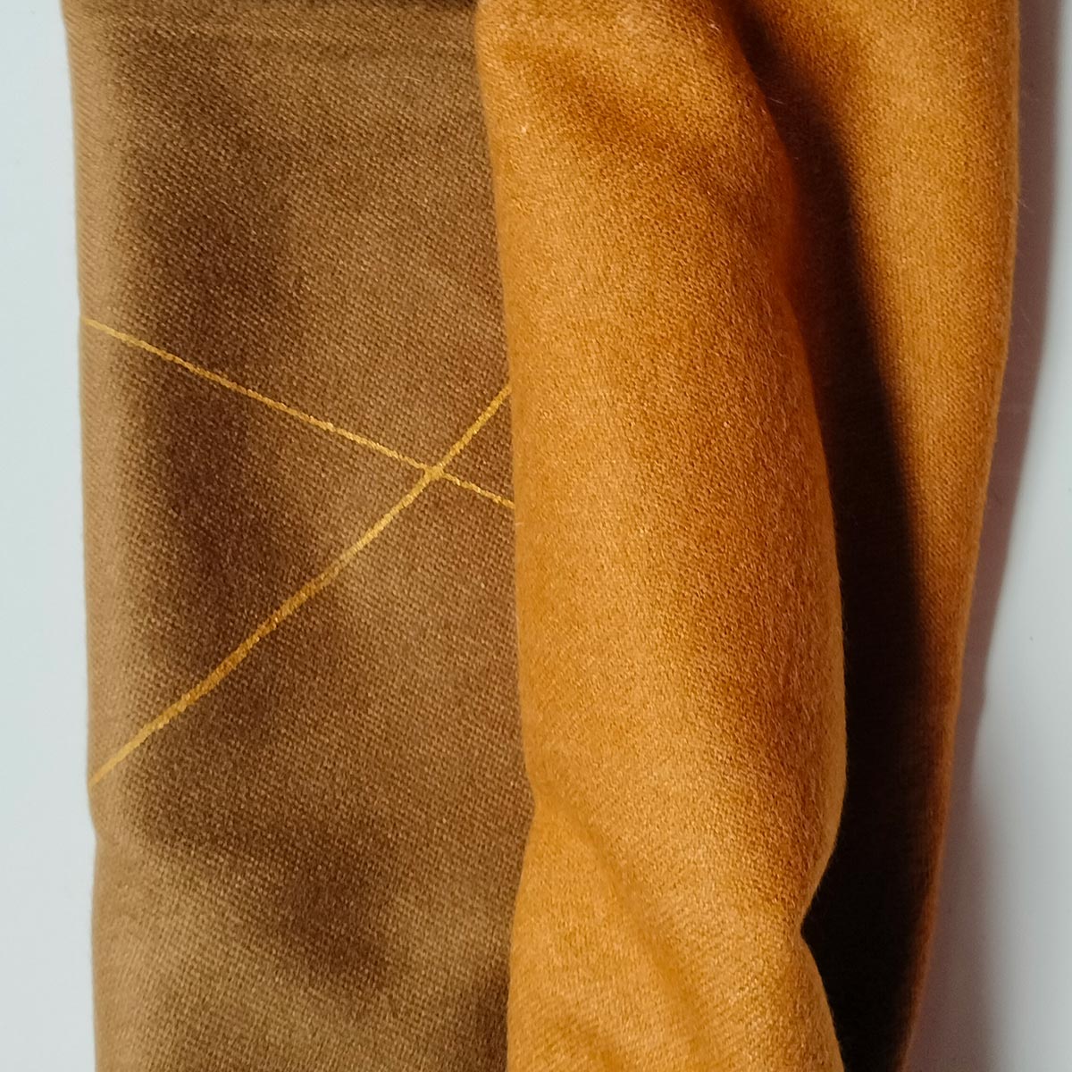 El foulard LÍNIES és una peça de llana amb acabat imitació de caixmir, coneguda pel seu tacte suau i càlid que convida a refugiar-s’hi. De doble cara, juga amb dos tons principals —ocre i terracota—, creant un equilibri entre contrast i harmonia.
