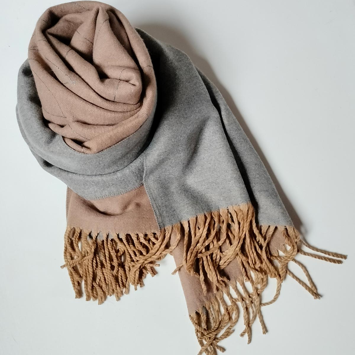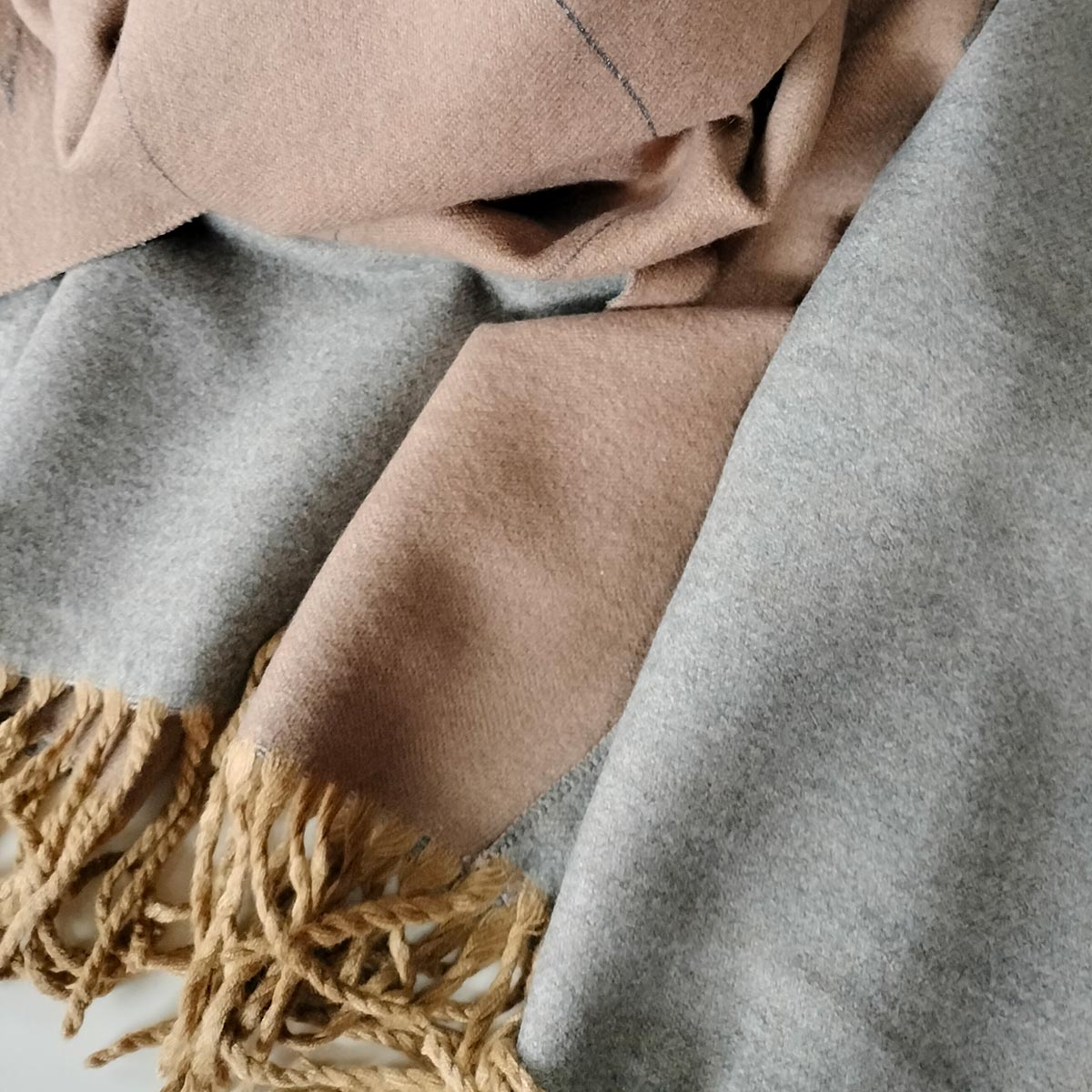 El foulard TREBLAD és una peça de llana amb acabat imitació de caixmir, coneguda pel seu tacte suau i càlid que convida a refugiar-s’hi. De doble cara, juga amb dos tons principals —beig i gris—, creant un equilibri entre contrast i harmonia.