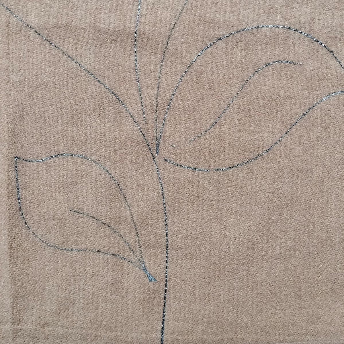 A una de les seves cares hi ha traços pintats a mà alçada, executats amb pintura especial per a llana en tons silver. Cada pinzellada hi deixa la seva empremta única, definint formes simples i elegants que reflecteixen l’estil inconfusible de KOKORA.