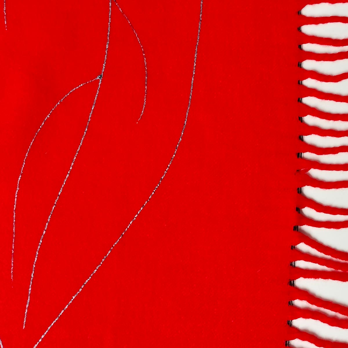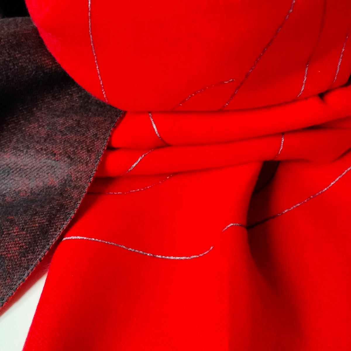El foulard TREBLAD és una peça de llana amb acabat imitació de caixmir, coneguda pel seu tacte suau i càlid que convida a refugiar-s’hi. De doble cara, juga amb dos tons principals —vermell i negre—, creant un equilibri entre contrast i harmonia.