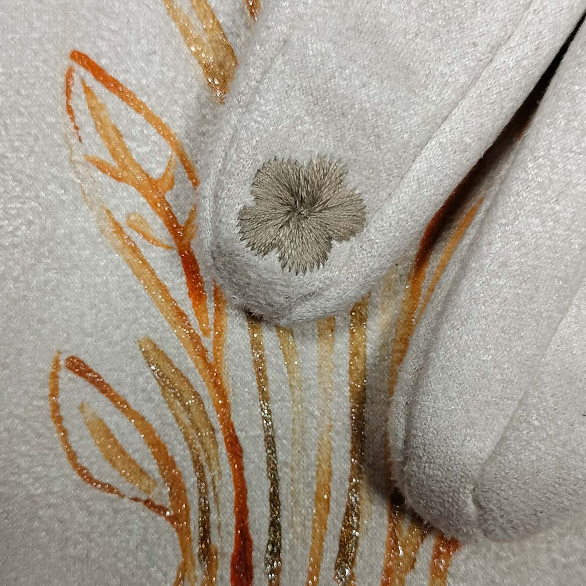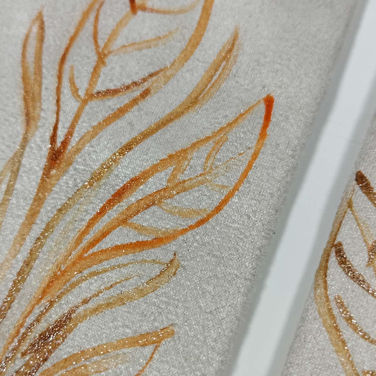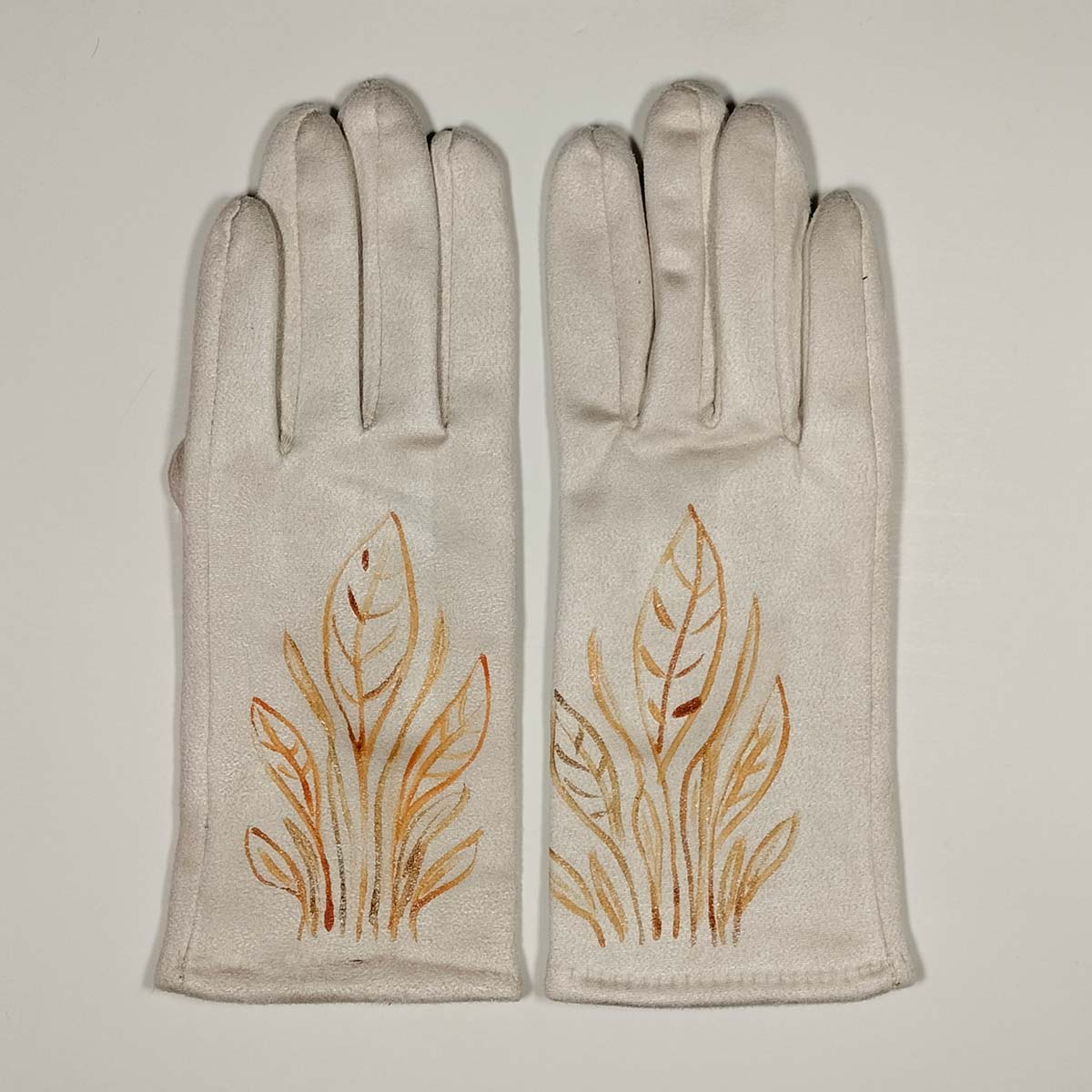 Inspirats en la natura d’hivern, els guants Trebal mostren un dibuix subtil de fulles pintades a mà sobre un fons cru suau. Les pinzellades en tons ocres evoquen la llum càlida de la tardor i aporten una harmonia serena a la peça.