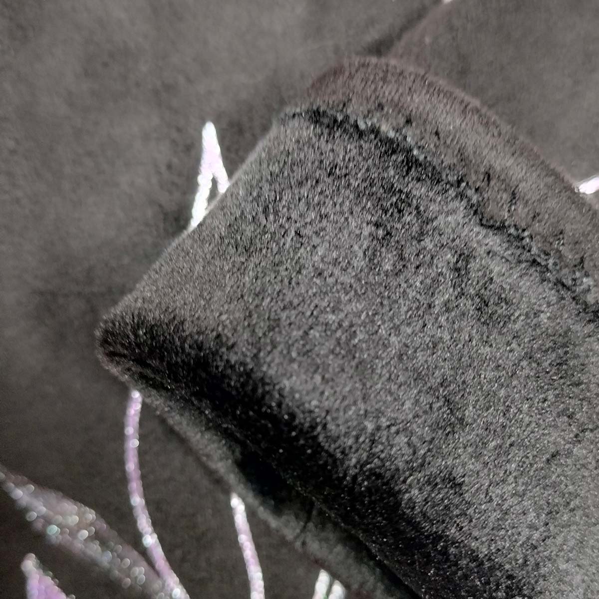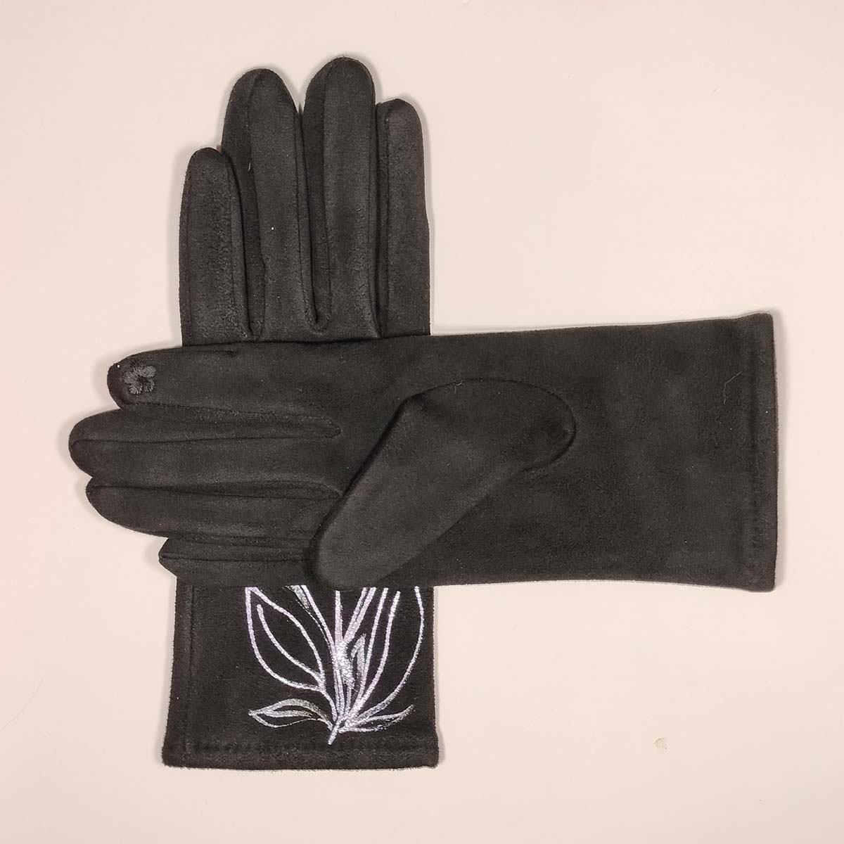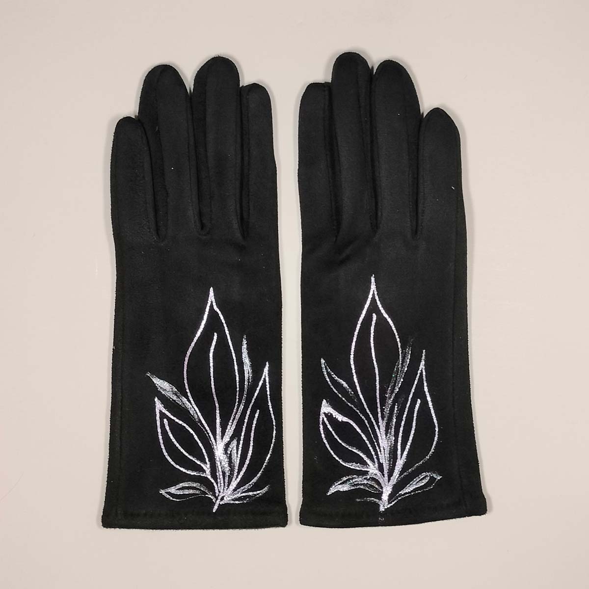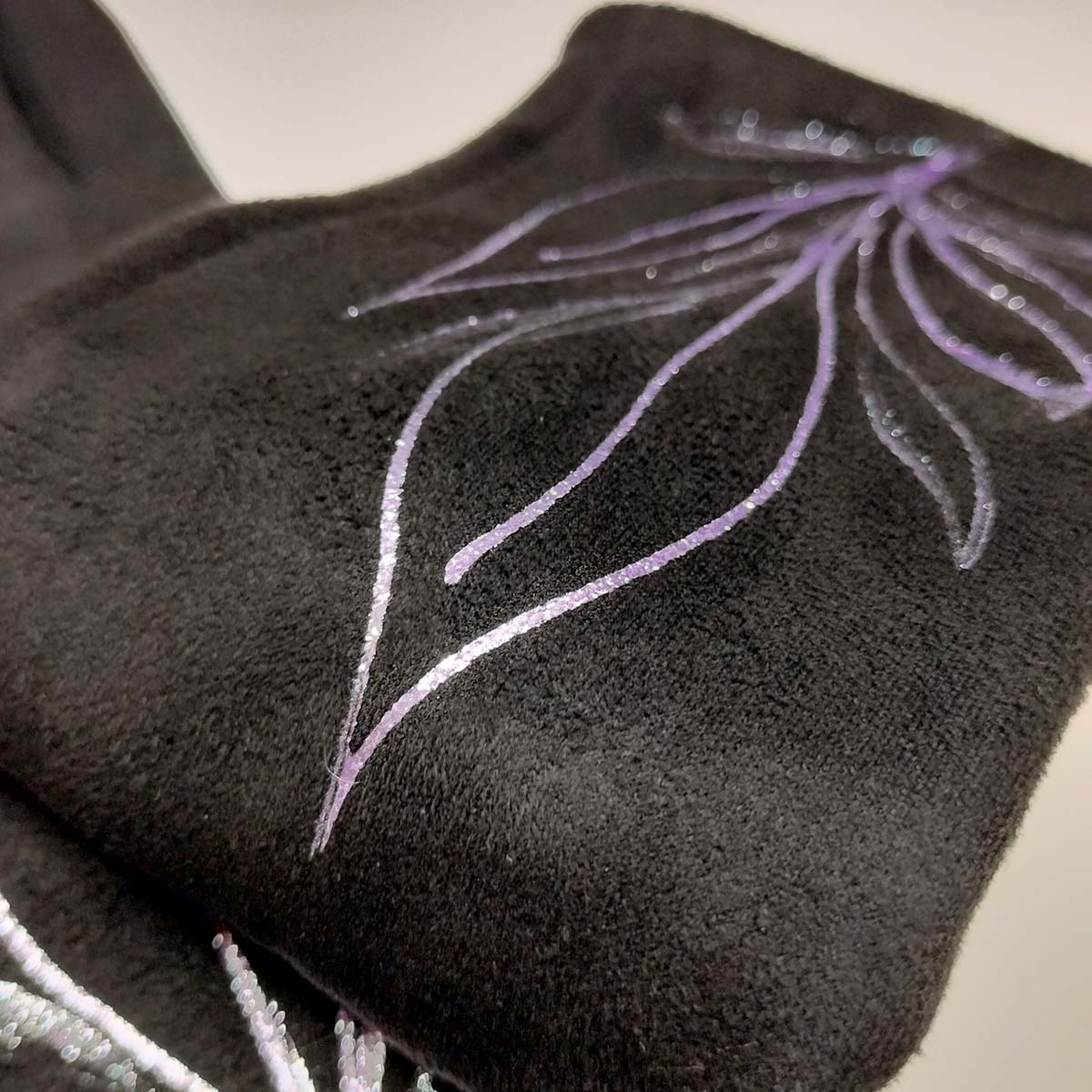 Els guants Trebal en tonalitat negra amb pinzellades liles combinen elegància i personalitat amb un toc d’enigma. Les fulles pintades a mà s’insinuen sobre el fons fosc amb traços suaus i expressius, creant un joc de llum i color que captura l’essència més poètica de l’hivern.