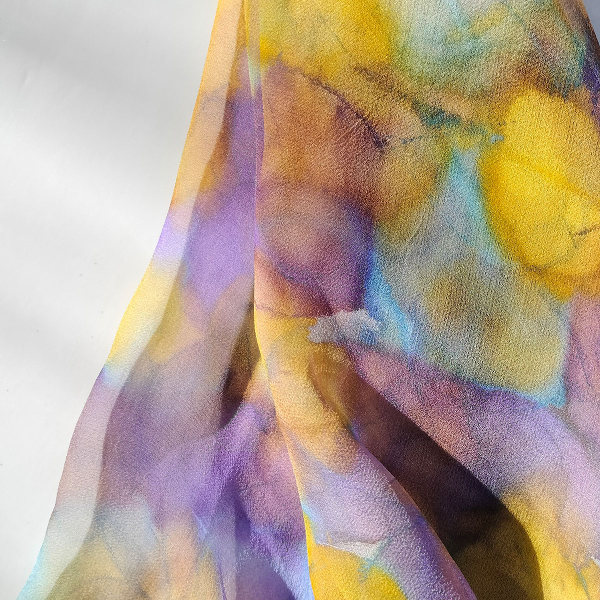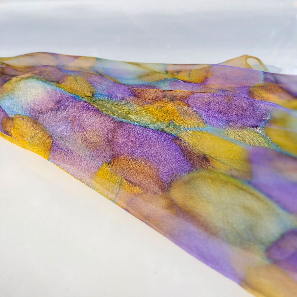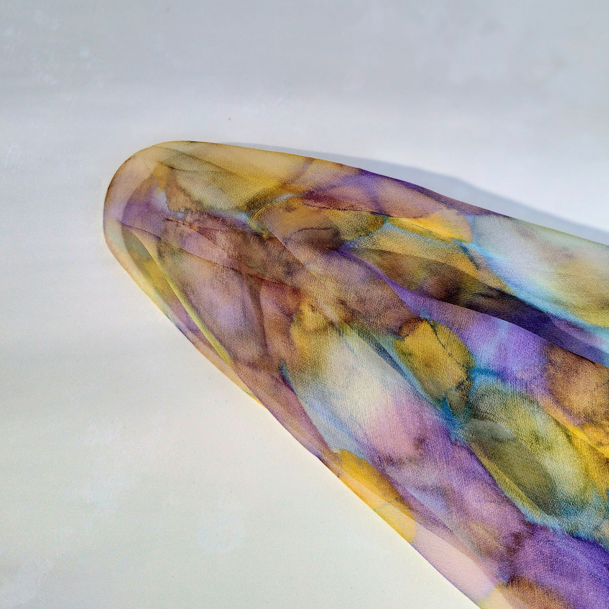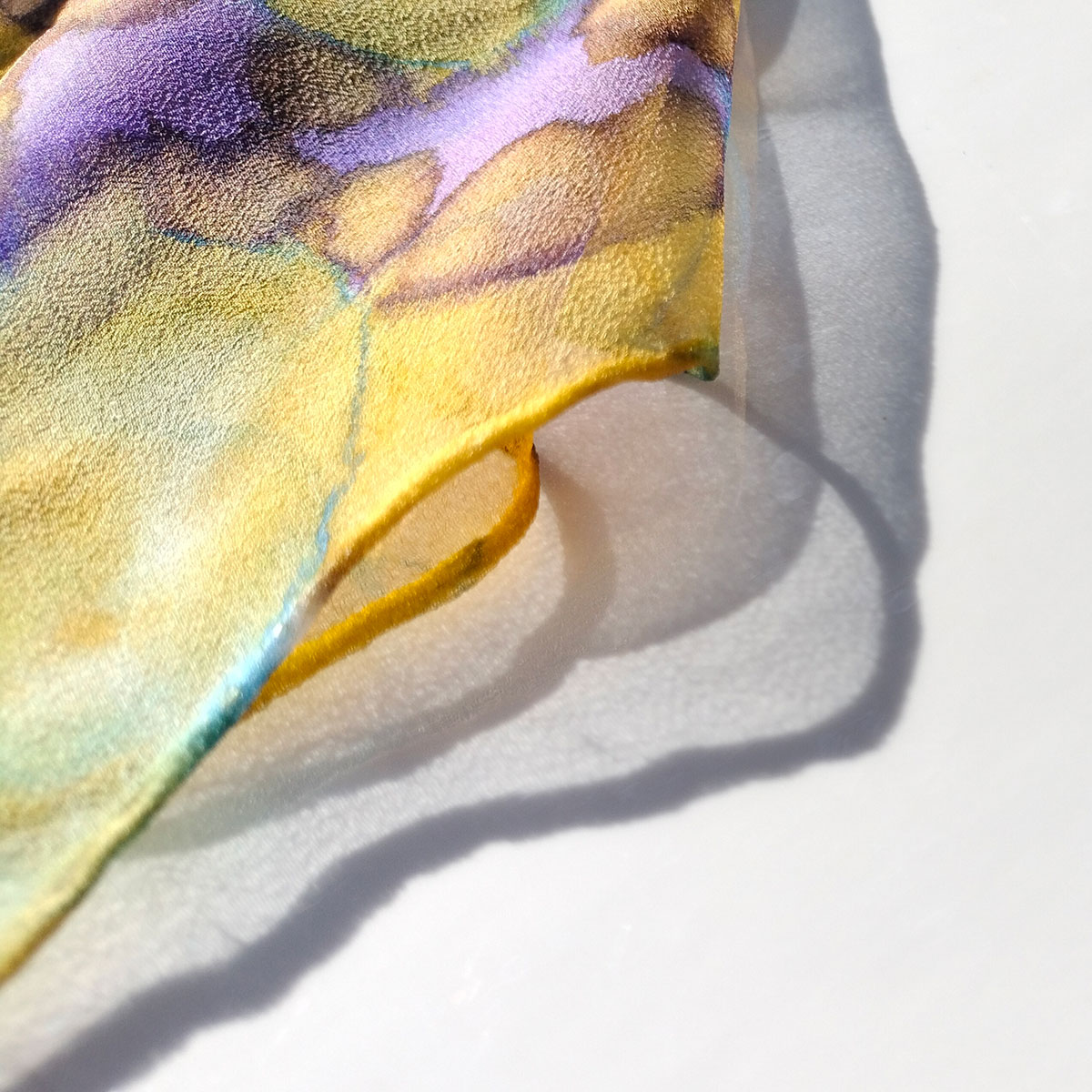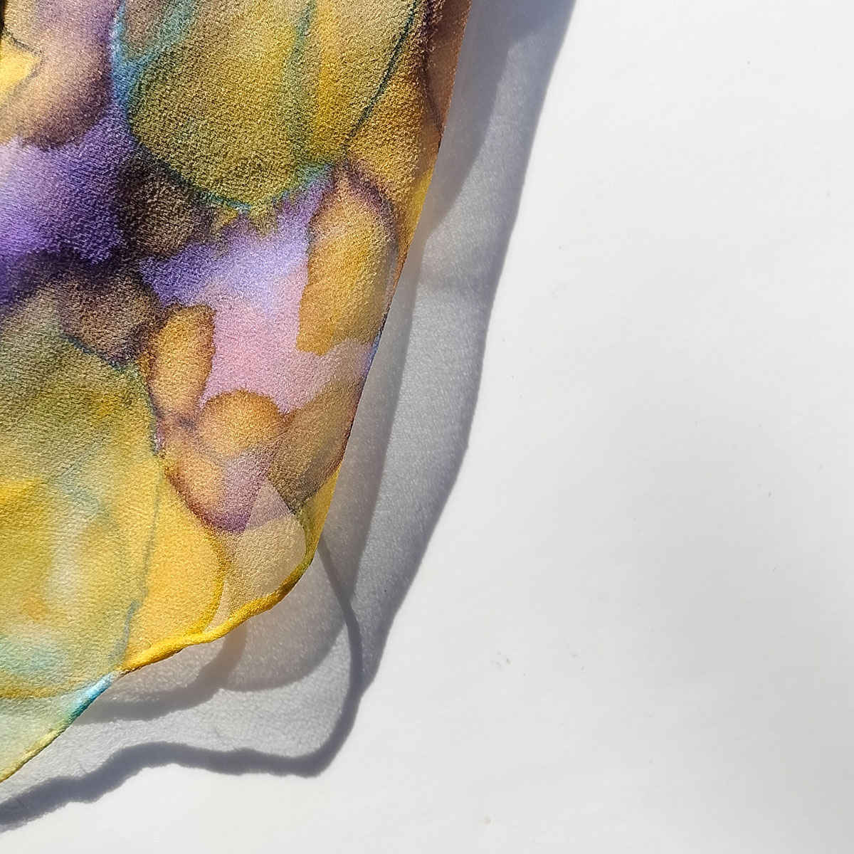 Cada peça és pintada a mà amb traç lliure i espontani, deixant que els pigments s’estenguin amb naturalitat sobre la seda per crear un efecte viu i orgànic.
