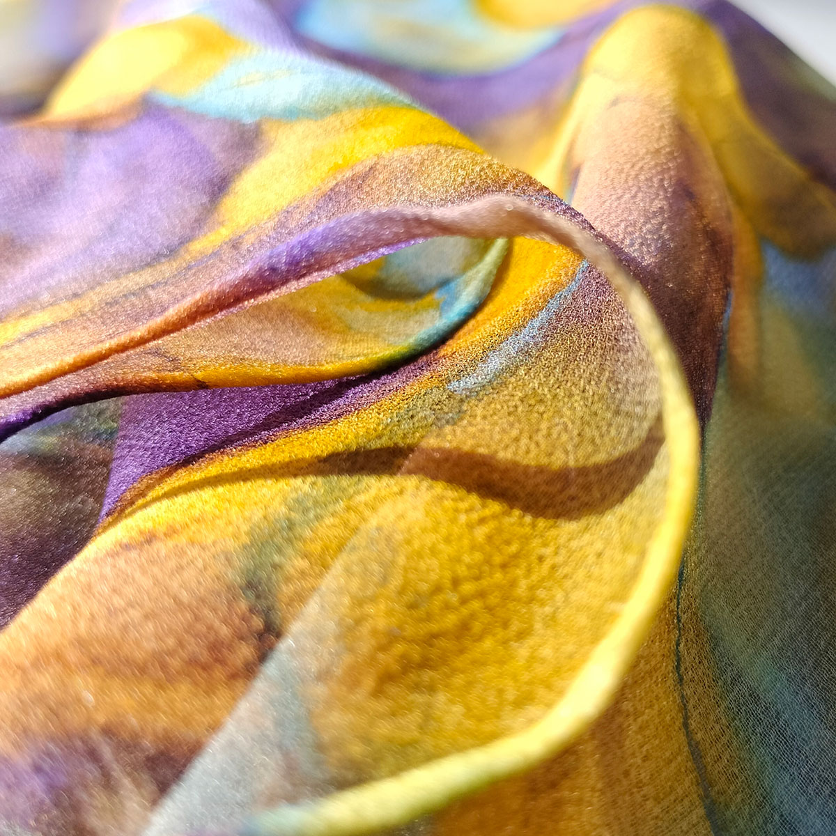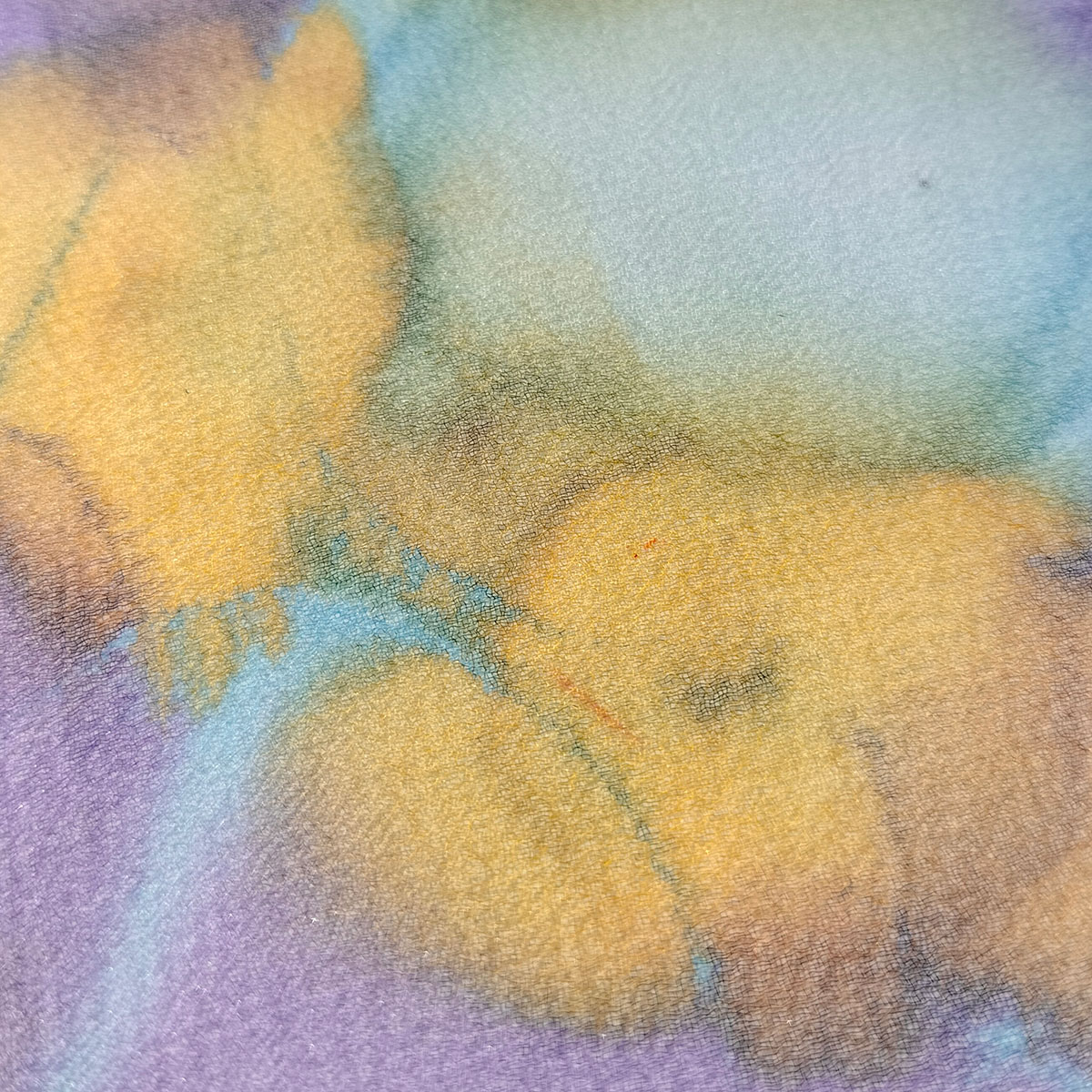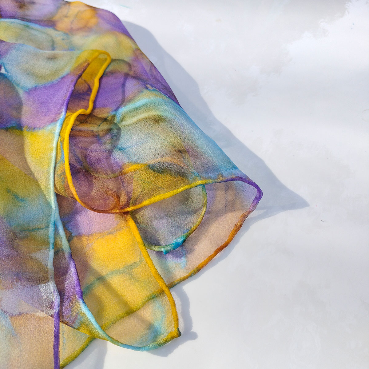 Un mocador que desprèn llum i serenor, inspirat en el moviment subtil de l’aire i en la dansa dels colors que es fonen amb suavitat. Els seus tons liles, groc i turquesa es barregen en cercles difuminats que evoquen harmonia, sensibilitat i un toc eteri de feminitat.