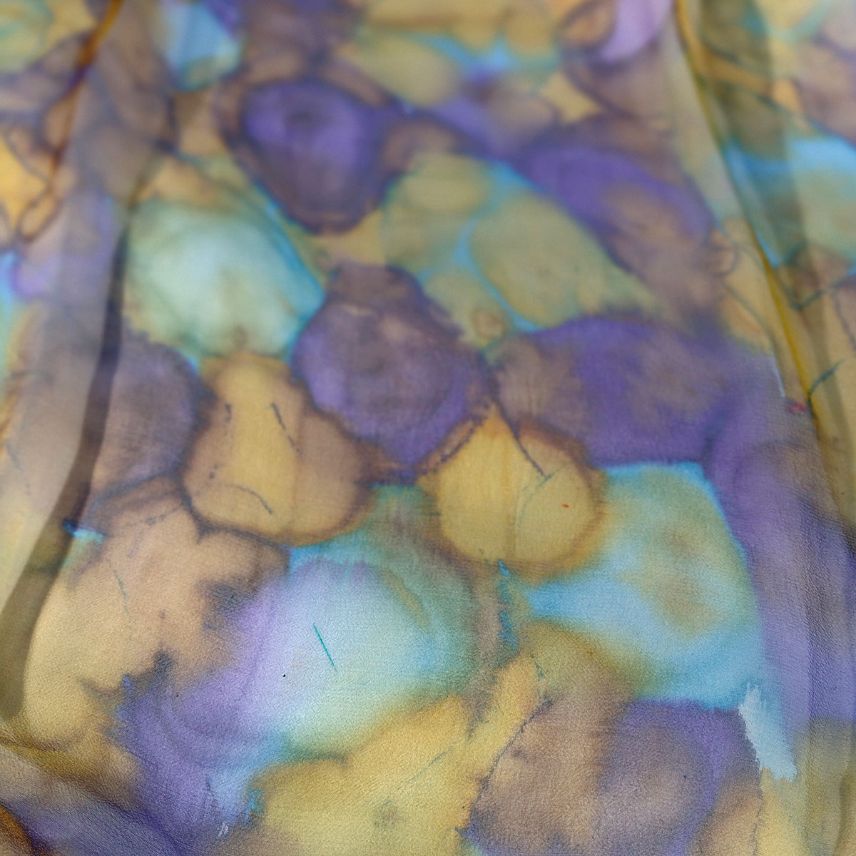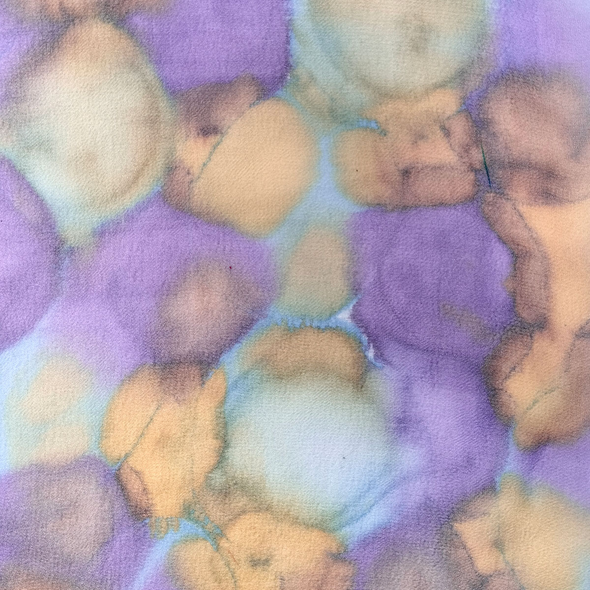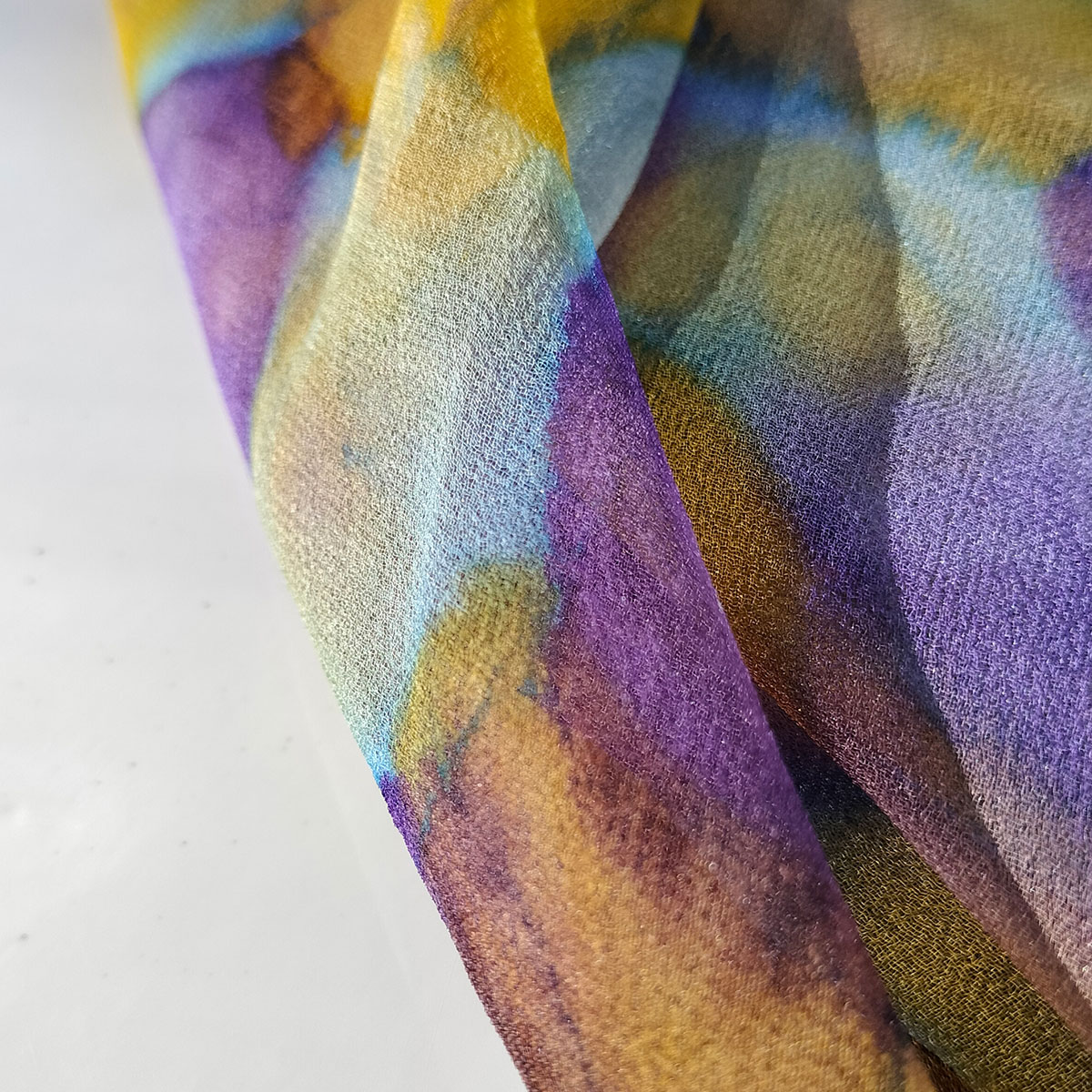 Un mocador que desprèn llum i serenor, inspirat en el moviment subtil de l’aire i en la dansa dels colors que es fonen amb suavitat. Els seus tons liles, groc i turquesa es barregen en cercles difuminats que evoquen harmonia, sensibilitat i un toc eteri de feminitat.