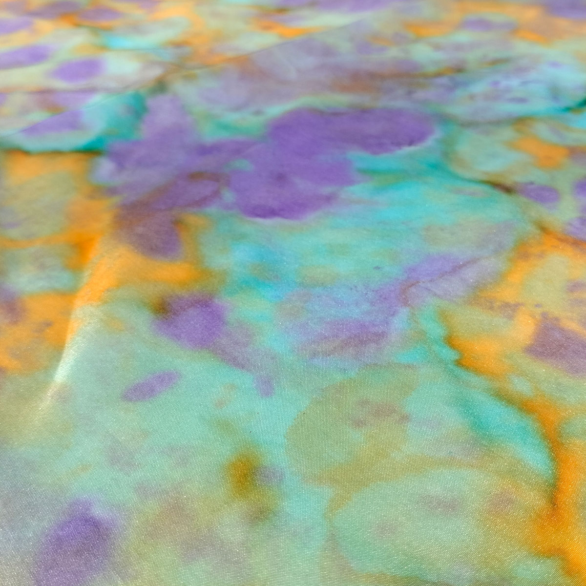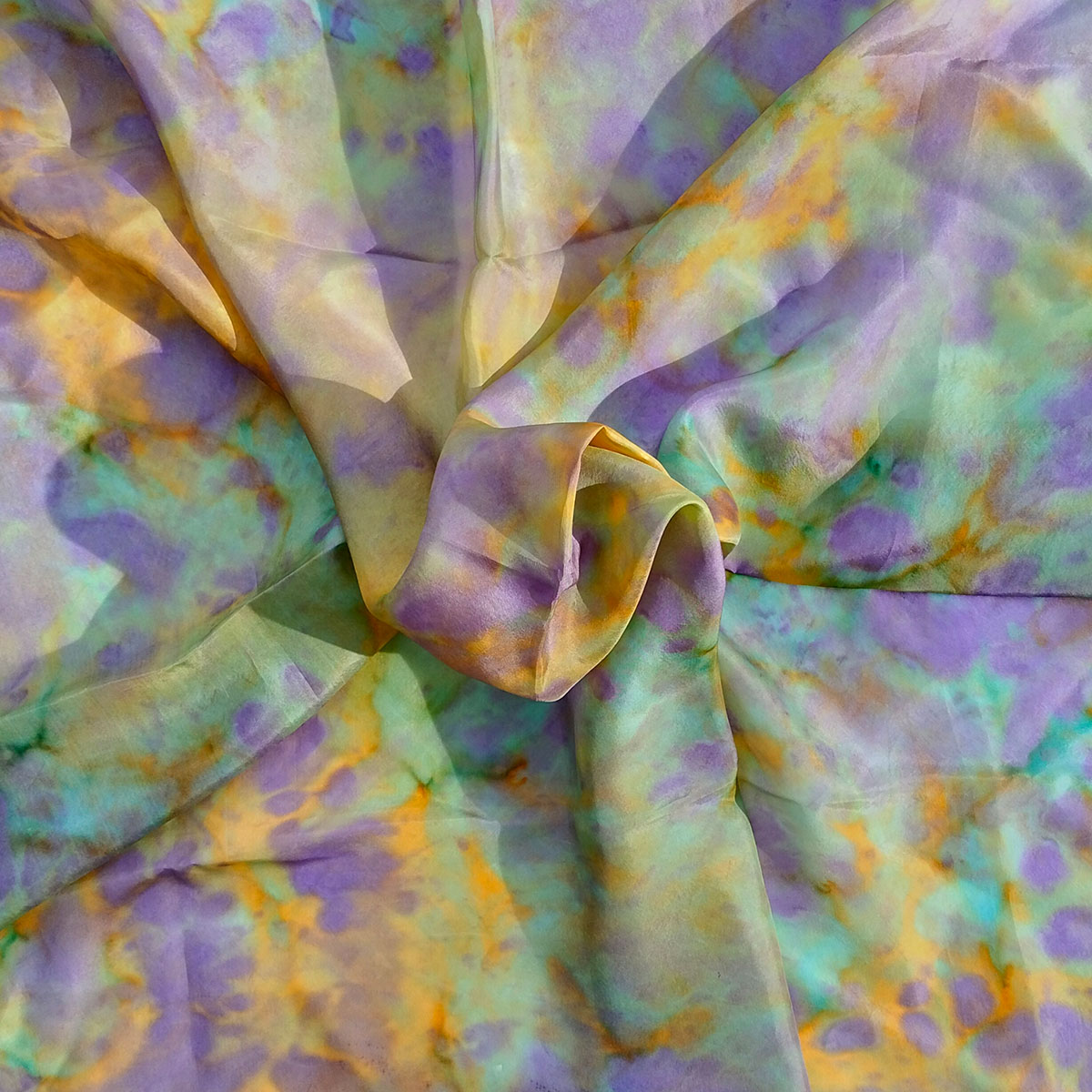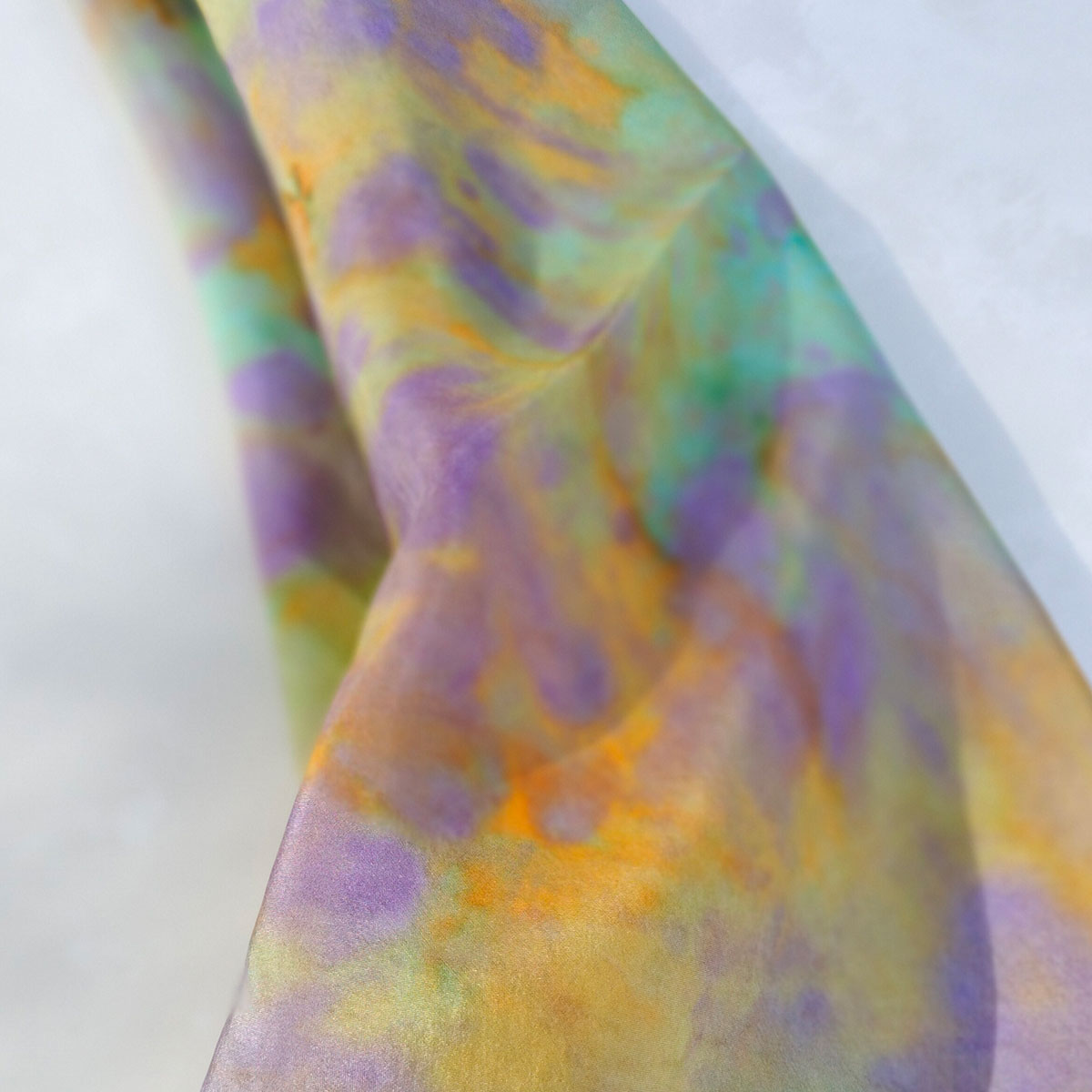 Un mocador que celebra la llum, la vida i el color del Mediterrani. Els seus tons liles, turqueses, grocs i taronges s’entrellacen com onades de llum sobre la seda, evocant el reflex del sol al mar i la calidesa del corall.