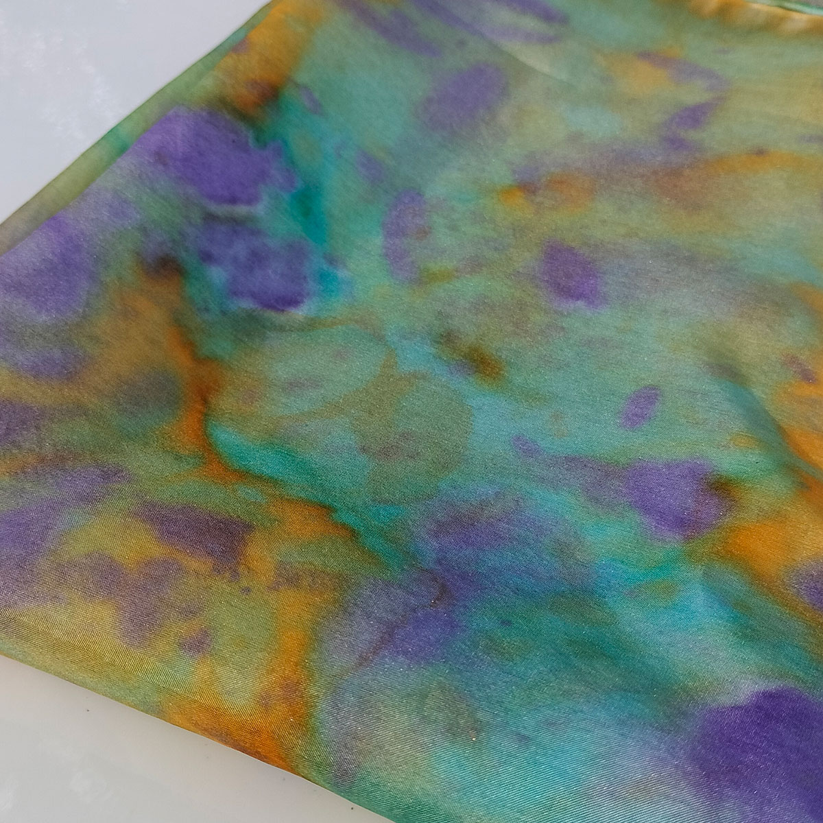 Cada mocador és pintat a mà amb traç lliure i espontani, deixant que la tinta flueixi sobre la seda com una dansa d’aigües i colors.