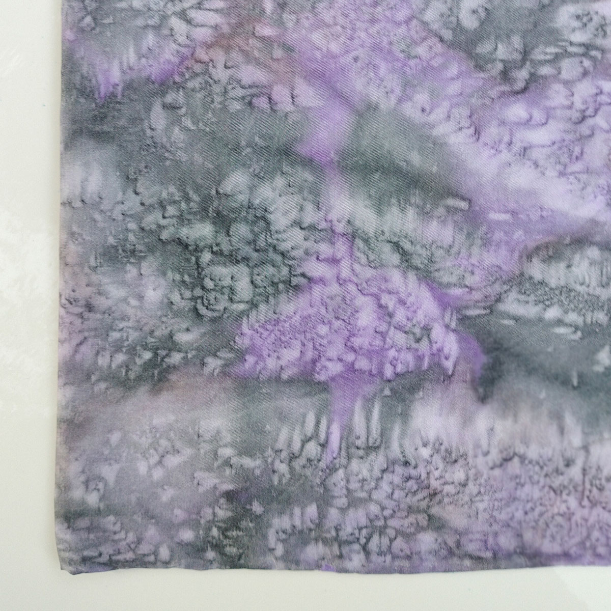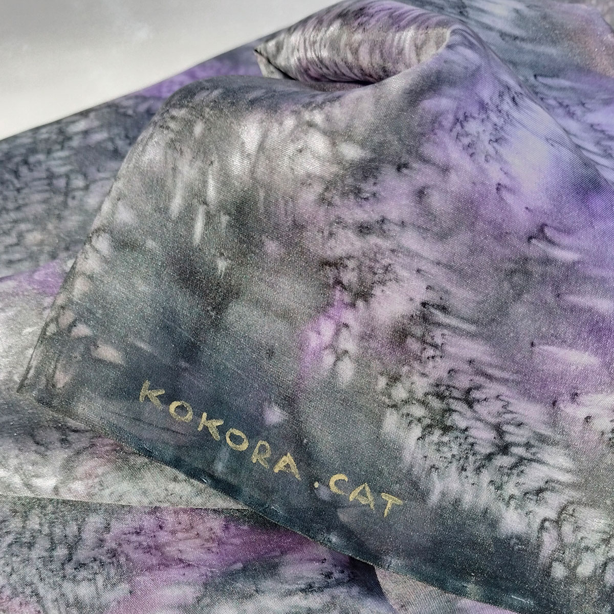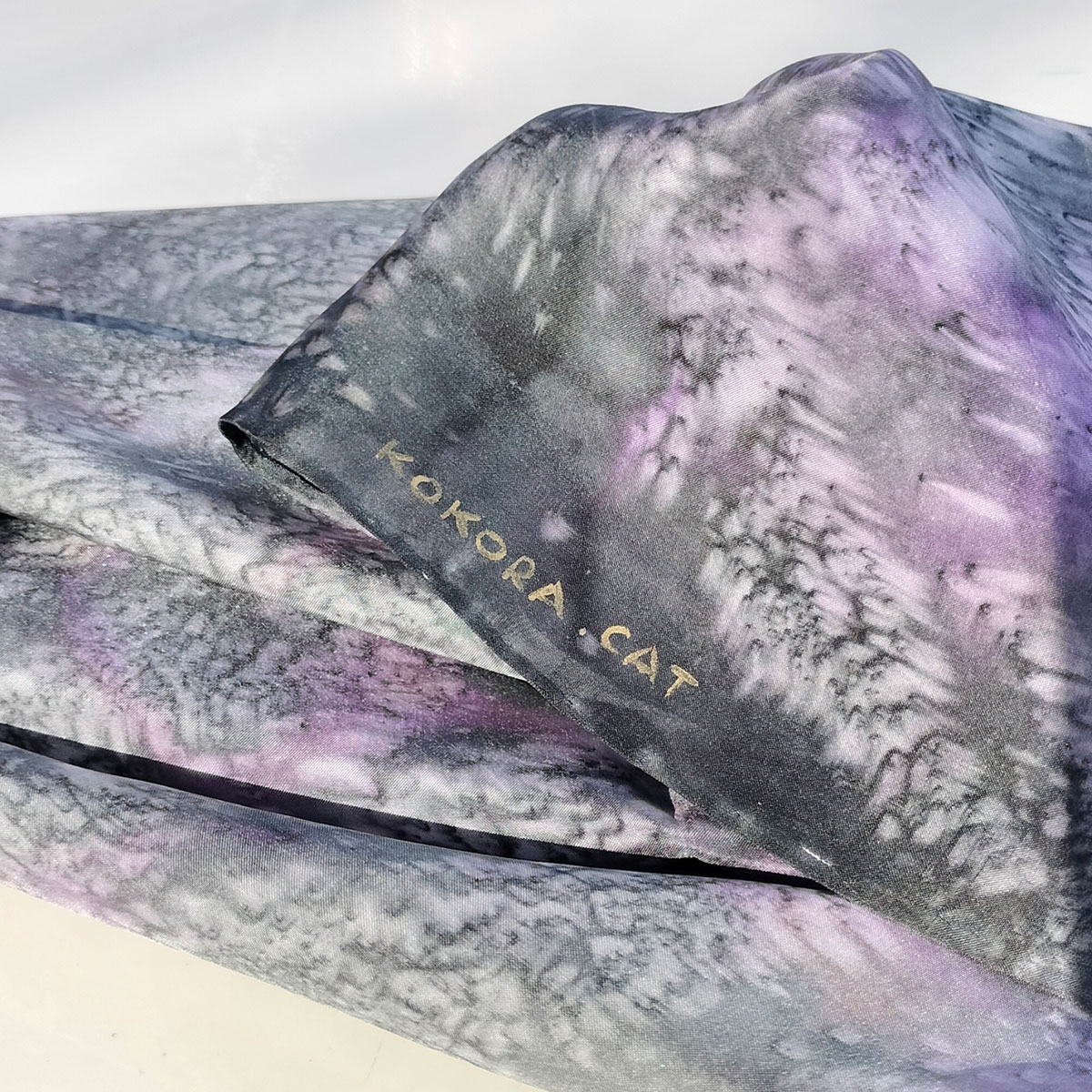 Un mocador que evoca misteri i serenor, com una dansa d’ombres i llum sobre la pell. Els seus tons grisos, liles i negres es fonen amb subtilesa creant aigües que flueixen com un pensament profund, revelant una bellesa intrigant i elegant.