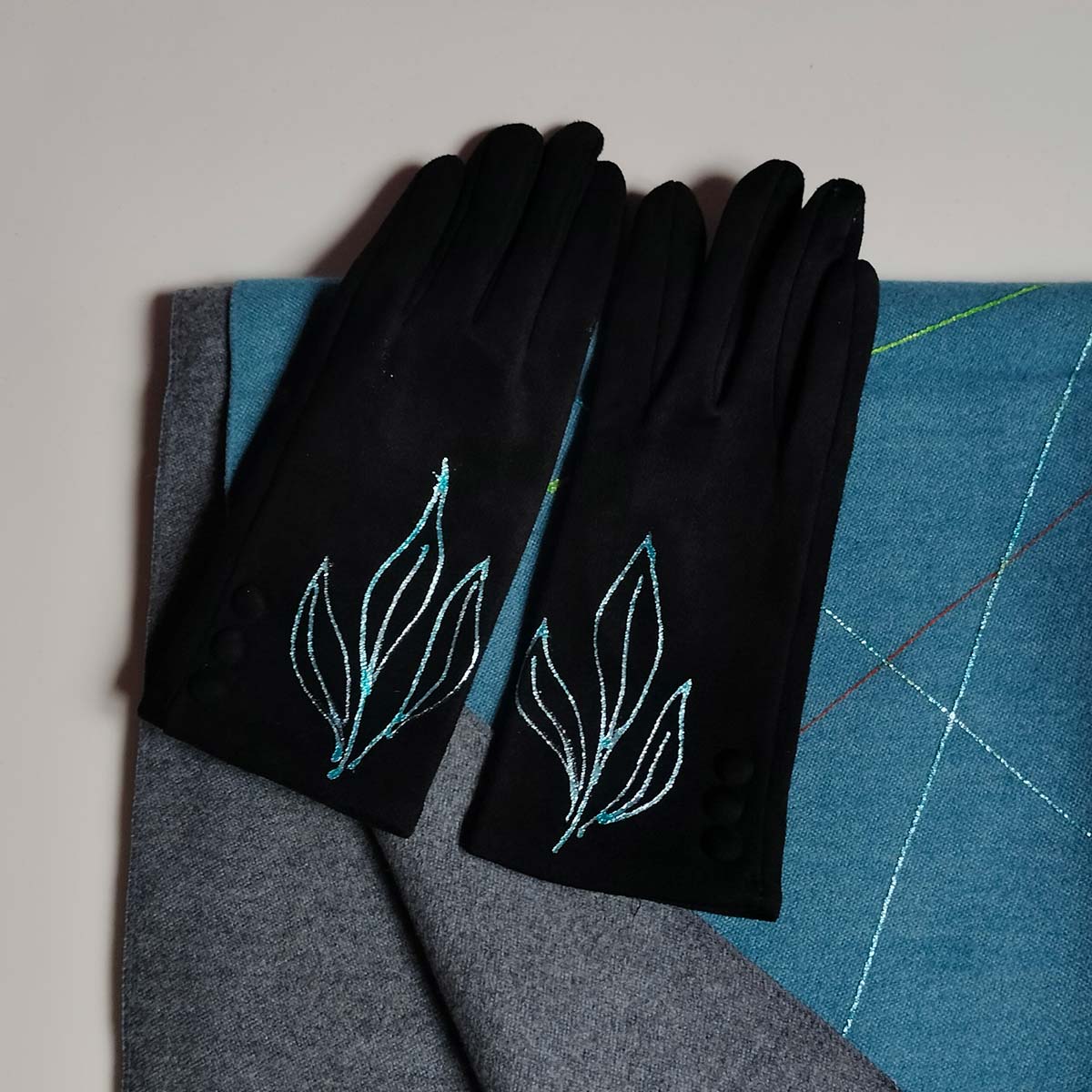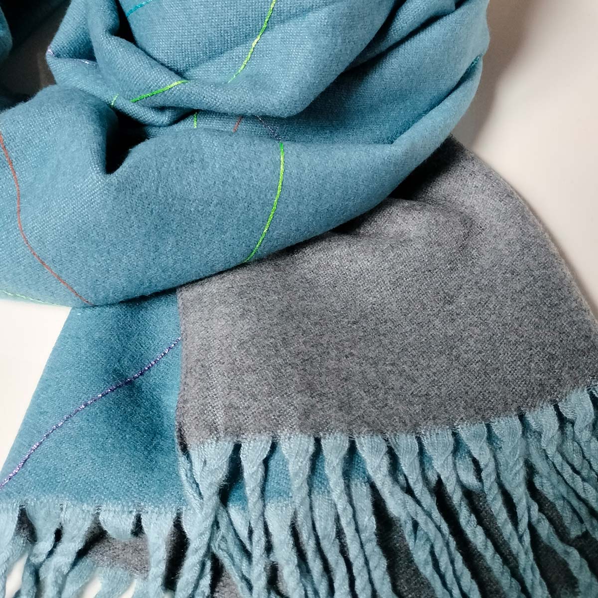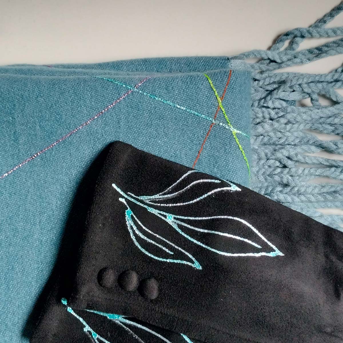 Un conjunt que parla de moviment, expressió i elegància contemporània. El foulard Línies, en tonalitats petroli amb traços pintats a mà de colors vius, transmet energia i creativitat amb cada pinzellada. S’hi uneixen els guants Treblad, de color negre amb tocs blaus turquesa, que afegeixen un contrast refinat i ple de caràcter.